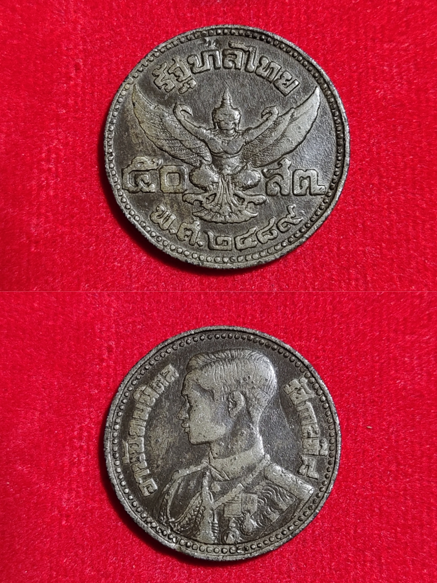 ด้านหลัง เป็นรูปพระครุฑพ่าห์ ด้านบนมีข้อความว่า “รัฐบาลไทย” เบื้องล่างมีอักษรและเลขไทยบอกปีศักราชที่ผลิต “พ.ศ. ๒๔๘๙” ด้านซ้ายเป็นเลขไทยบอกราคา “๒๕” และด้านขวามีตัวอักษรย่อบอกหน่วยราคาเหรียญ “สต.” มีจุดไข่ปลารอบขอบเหรียญ